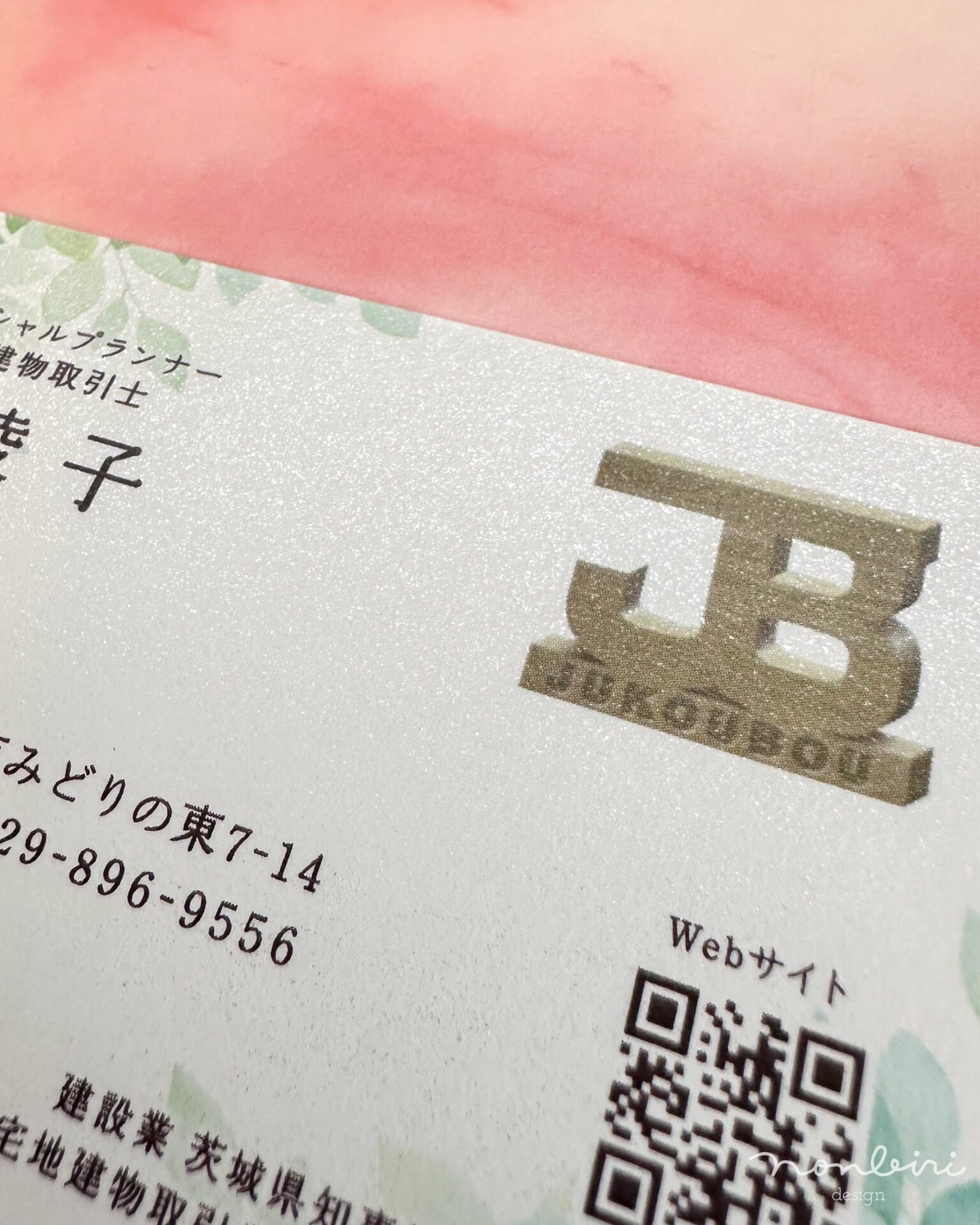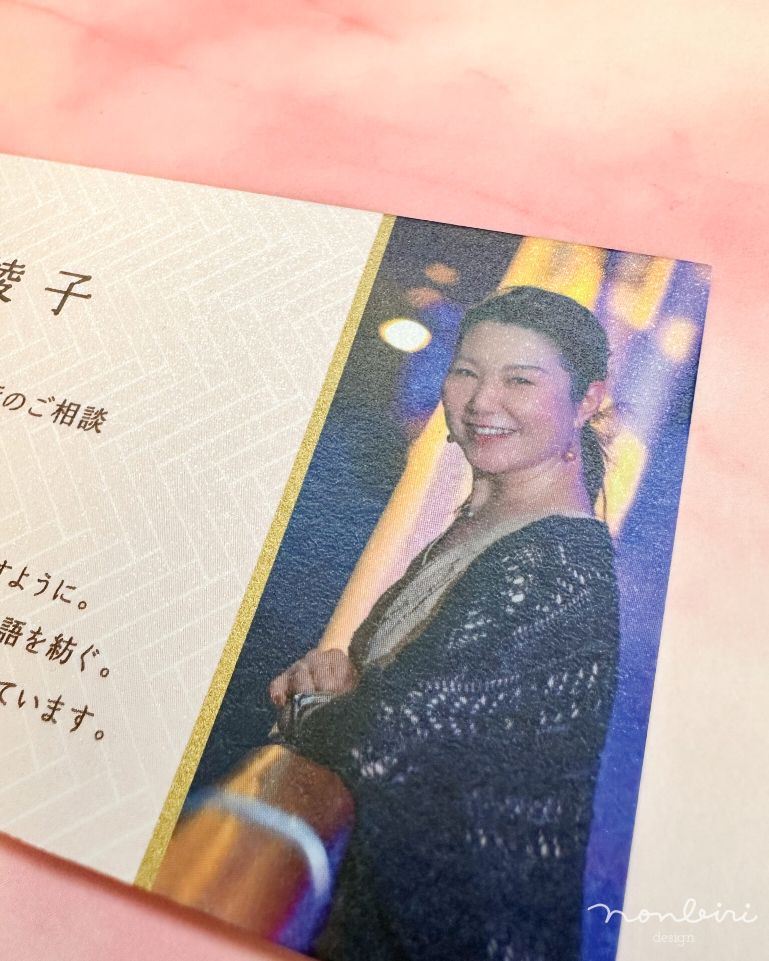 名刺のデザインは、オフィス綾の面は、女性らしいカラーと綾織の模様をご希望され、背景に繊細なパターンを組み込みました。