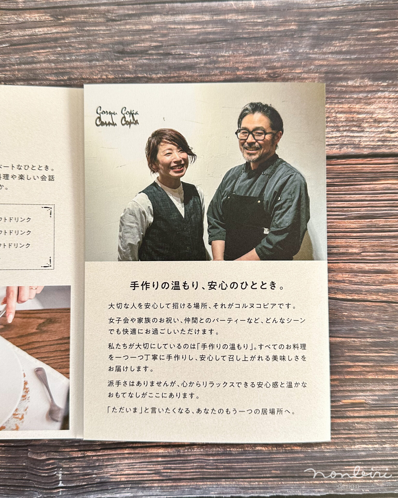 料理の美しさや空間のあたたかみがふわっと伝わってくる、やさしくて芯のある世界観が、このリーフレット全体の空気をつくってくれました。